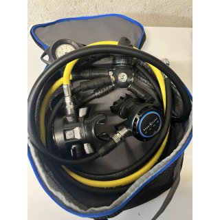 vente d'un détendeur Aqua lung DIN équipé d'un 2e étage Core + , d'un 2e étage Core (octopus) et d'un manomètre . Le tout vendu avec le sac de rangement.